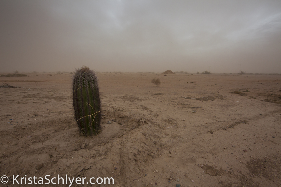 Previous Image Next Image 11. Land cleared of desert plants is slow to recover and prone to dust storms. Denuded desert landscape during windstorm.