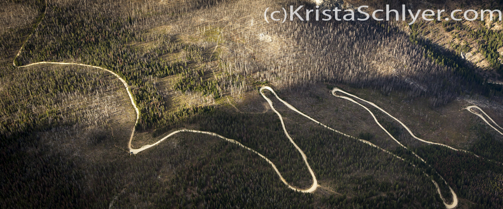 Previous Image Next Image Burned landscape iand roads in the Bitterroot Mountains, Montana. Road through Clearwater National Forest