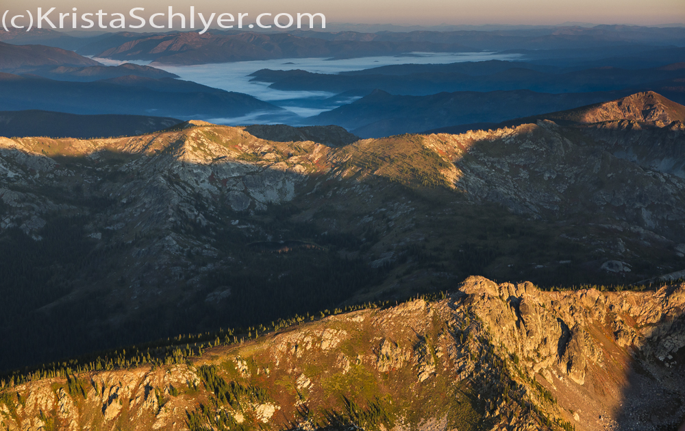 Ridgeline near Blacklead Mountain in the Clearwater Basin, Idaho. Kelly Creek covered with fog in the background.
