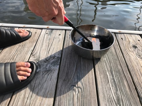 You also have to take off any reference to the new name, prior to the ceremony. I gathered all this up, including Original Maggie May’s ashes, which sit in a central spot on the boat. We put all of this Maggie May gear on the dock. I covered the stern with a scarf, because Maggie May has her name there. Once all this was done, I waited til Bill was feeling a bit better and then roused him from his sick bed. We carried out the ritual, using the prescribed plea to Poseidon to vanquish the names of Vilkas and Kahouteck from his records, and to add Maggie May and watch over her.
