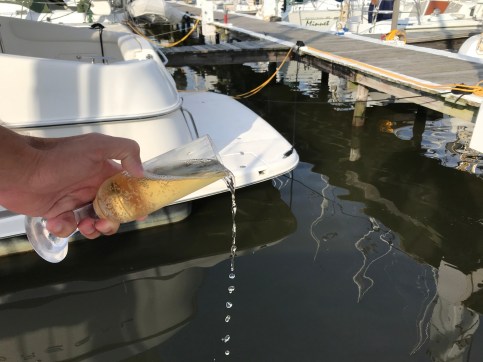 The renaming ceremony requires writing the old name of the boat on a piece of metal with water soluble ink, which you will drop in the water. I didn’t have a metal name plate, so I wrote Vilkas on a potato chip in pencil, and Kahouteck on a Ritz cracker. I worried about not following proper procedure, but I figured if it was an item of great value it would work just as well, and dissolve all the faster. Poseidon would be pleased, and Vilkas and Kahouteck would give some “nourishment” to the fish.