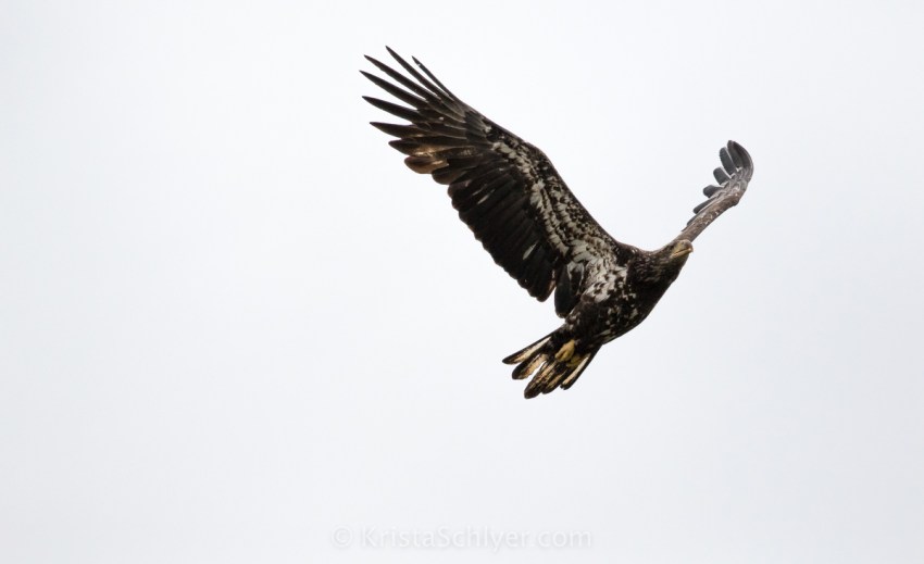 Crows fly out of the forest bluff as a dark cluster, a Gang of 8. Three of them break off and dive swiftly toward the water, then level off a hands-breadth above the sparkling surface. I can only presume they are wanting to feel the wind as it glances off the waves, pressing up against their bellies and shining, sun-warmed black wings. With little fetch the wind can only stir the water into low peaks, but they are insistent and serious as they march toward me, pass by without a glance, and continue ever on toward land. One after another, they take my every thought with them. Sparing only one. That as the juvenile bald eagle circles round and round on thermals that rise along the forest edge, he is engaging in something pointless, perfect, meaningless and a complete distillation of all the meaning the world has ever held: he is practicing his communion with all that is within, and all that is without. He is learning how to soar like only an eagle can.