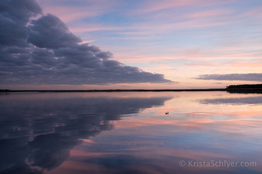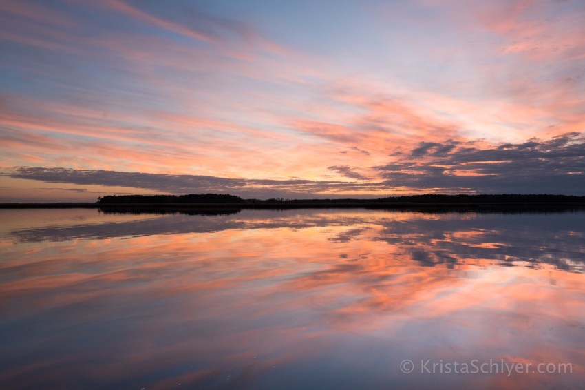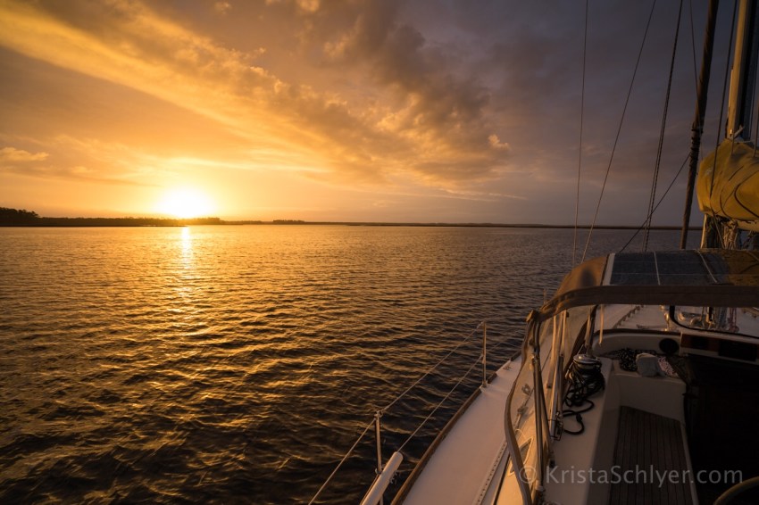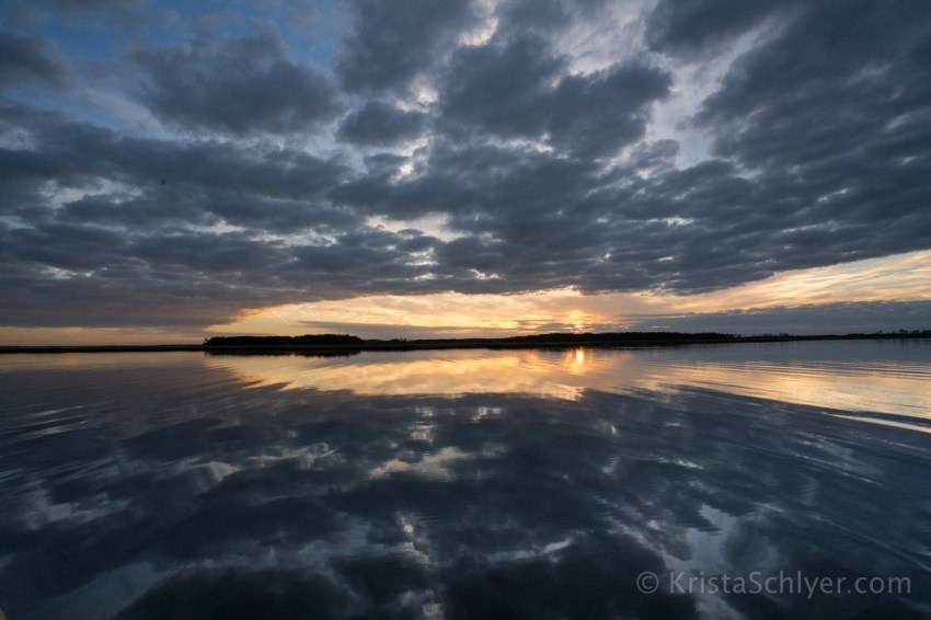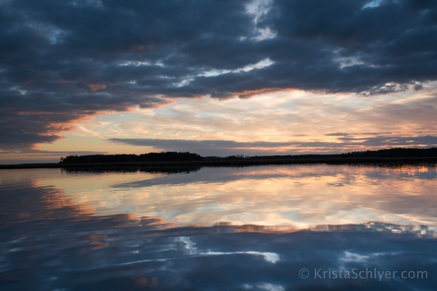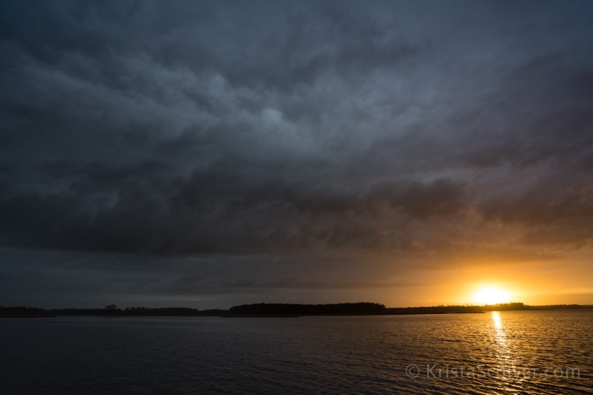 As I write a steady rain begins to fall. I sit in our protected cockpit looking out on the world, listening to the rain tap and patter against the canvas that shelters me. The temperature this morning has risen to the mid-60s, giving a welcome reprieve from near freezing temps much of the past week. The eagle has left its tree in search of a more protected perch. My mind lingers on the sunset of yesterday. Around 4:00pm we had just anchored and I bid Bill to make haste so we could watch the sun go down. I had a feeling about this one. The sky was getting ready to share some secrets. I set out some pillows on deck and we sat for an hour as a parade of light and cloud and watery reflection marched across the horizon and consumed our every emotion and thought. Perched in a tree behind us, the eagle had also watched the scene unfold. We three watched and watched until the darkness was full upon us.