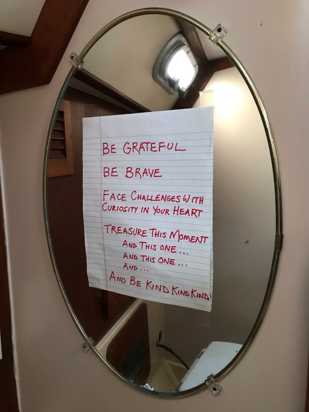Today we find ourselves in the Pungo River watching the tail end of a rainbow alight on our bald eagle neighbor in its snaggy tree. It is coincidentally, Thanksgiving Day, my own favorite holiday. For the food. (Our propane is gone so we will be eating rice today.) For the resilience of this holiday against the ever-expanding consumerist takeover of holidays. (Not counting Black Friday because it comes after.) But mostly I love Thanksgiving for what it it celebrates. Not the part about Europeans coming to conquer and take this land for themselves, for profit, for religious expansionism. I wish that history had gone differently. I can imagine a different present day if those who carved European history into this land had held a different view of themselves and others and the land itself. To love Thanksgiving I accept its disastrous historical beginnings with a heavy heart, and look beyond to the feeling that prompted the first observance. A feeling universal in all creatures in some fashion. Gratitude. An overwhelming feeling of humble appreciation that through hardship and struggle, even at times near unto death, we live …for now …with the eagle in the tree, and our next door neighbors, and best friends and family (be they near or far), and our most beloved of fellow creatures. We can see and listen and be awed by this beautiful world. By rafts of arctic birds resting out the winter on the Chesapeake Bay. By the sight of raindrops pregnant with sunlight falling from the boom. By the sound of loons calling through fog. By the sight of my sleeping bag and pillow fluffed up and laid out with care by Bill on the coldest of nights, and the knowledge that in a little while I will be warm and safe and have some time for blessed rest.
