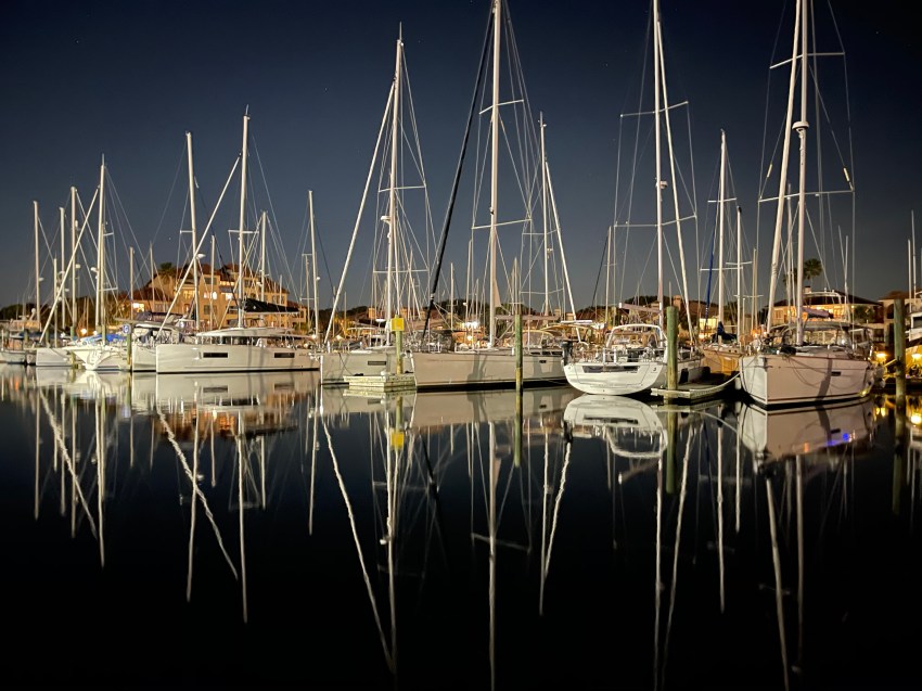 Stillness in the Camache Cove marina, the night before departure in St. Augustine, Florida.