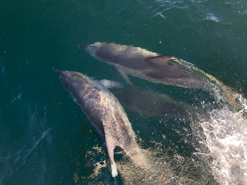 When you need to go one way and the wind strongly suggests you go another, you may be able to do what you want, but wind and water will make sure you suffer for it. We had to go our way. The wind wanted us to head toward the Gulf Stream, with a cold front blowing in from the north. That is the worst possible scenario. We were not going there. So we sailed on as best we could until the wind wandered off altogether. We also needed to get where we were going at a certain time. Inlets are often challenging for boats, as evidenced by our exit from St. Augustine. We hoped to time our arrival at the Fort Pierce inlet for slack tide the next afternoon, so we wouldn’t be facing the rage of an outgoing current against a wind coming from the east, or heading into the unfamiliar inlet in the dark. Rather than toss around on the ocean until the wind returned we switched on the engine. There was an upside to this. With just an hour of daylight left, I spotted a dolphin near the bow, and then another and another. They were following the boat, surfing our bow wake. I scrambled up to watch them darting in and out of our wake, a confluence of effortless power, speed and grace. Like creatures built of nothing but water and light, chaperoning Maggie May into the night.