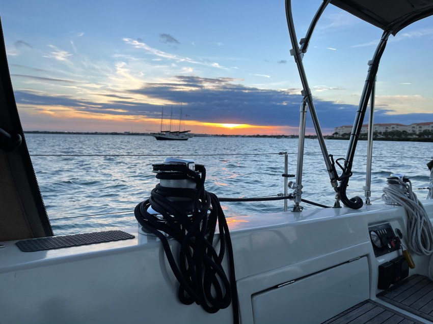 Before long the sun had broken the cloud forest spectacularly, the clouds fracturing its piercing rays into diffuse beams of yellow and orange. For the rest of the morning Bill and I sat watch together. When we were about 2 hours from Fort Pierce, the wind began to pick up so we were able to turn the motor off and sail the last stretch. The wind continued to increase to a steady 20 knots and we arrived early to the inlet, about 2 pm, with low tide forecast to be 3:08. We needed slack water, so we turned around and headed back out for 45 minutes before turning around again and sailing back in.
