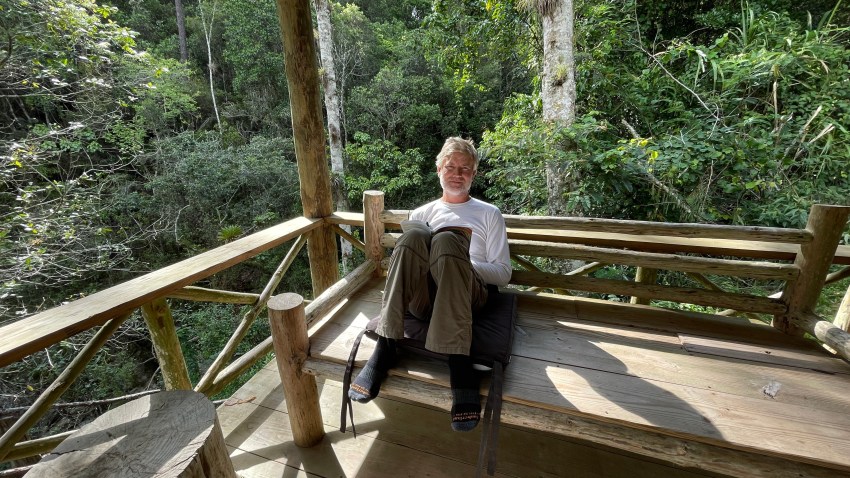 Captain Updike reading about creating a sustainable economic system, while sitting in the mountains of the Dominican Republic.