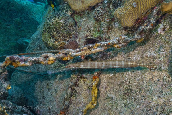 In the shallows of this house reef is a vast sandy area, speckled with coral heads. Some are living, vibrant coral islands, others are dead and little more than rock. Also in the shallow sands people have dumped tires, old engines, pipes, construction waste and other detritus of unknown origin. The waste speaks poorly of the human species. It is however a tribute to the ingenuity of the natural world, the members of which have repurposed the rubble. Trumpet fish shelter in heaps of dingy rope, eels hide in old pipes, blennies perch like tiny ornate seals on engine parts colonized by spreading corals.