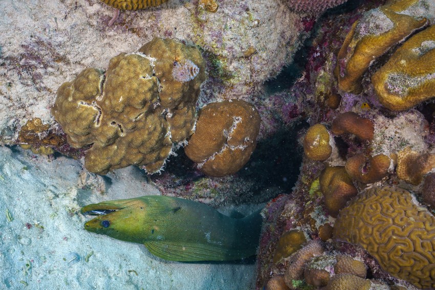 The following day, again I swam my circuit. The green moray under the boulder lay still, utterly and forever still. His once smooth, leaf green body was mottled, discolored with dark patches, and almost completely covered in a fine layer of silt. I swam down, saw the finality of his situation, then floated quietly above for some time. Nearby a lizardfish and trumpetfish had a brief, non-violent exchange. The the lizardfish skulked away. The trumpetfish ghosted above the eel’s body. I could hear the munching of parrotfish teeth on rock. Of waves crashing against the jetty. A spotted drum peeked out from a hidden place.