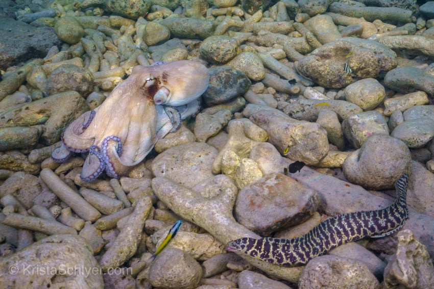 I continued on my same path, hoping to see the octopus again. In the shallows I did come across an octopus, but not the same one. This was a much smaller creature in a different location, and right beyond her, under the shallow ledge, a huge green moray eel. A healthy one, tucked almost entirely under the ledge, with an attendant juvenile angelfish. These juvenile fish often serve as cleaners for predators like eels. The little fish get something to eat and the predator gets a grooming. Proximity to great scary eel offers the little fish some protection from its own predators.