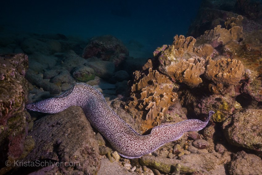 One of the eels, the largest, was fully out and nosing into a small crevice beneath the rock. A second, slightly smaller eel was nearly out of its crevice on the heels of the other. The third was watching closely, but waiting in safety for an opportunity to present itself. Suddenly, the largest eel plunged toward the bottom of the rock. Its head disappeared then bam! it stopped abruptly, the rest of its body too thick to cram inside the hole. It jerked itself out, paused for a disgruntled moment and then swam around the rock and disappeared into a pile of rubble behind it. The second eel seemed to be considering its options. I think it was wary of me, but driven by hunger. There was food under that rock. The eel ventured out a bit from its hole, then slunk back in. Came out a bit more, then slunk back in. After a few wavering minutes it ventured all the way out and swam toward the bottom of the rock. One moment passed, uncertainty, hesitation, then resolve. It jammed itself into the small hole. Like the first eel its head disappeared but then it stuck hard, its flesh ballooning out with pressure. But rather than retreat, it heaved violently inward, forcing itself into the hole. In my mind there must have been a scraping of hard rock on soft skin. A tearing injury. I had only a blink to ponder this harm because in fractions of seconds, in a tumult, in a thrashing blink of a moment, there appeared in the near dark a tip of an eel’s tail, then a ball of what looked like an eel torn in two and tied in knots. Thrashing, confusion, then finally clarity. The eel was in a ball, but it was not ripped, it had ripped an octopus from that hole, wrapped itself in a ball to extract and hold the struggling creature, then, after a breath of time, swallowed the octopus. For one brief second, two of the octopus’ legs held desperately to the rock. Grasping, one… last… moment… of life. And then the end. It was gone. No more than a bulge in the throat of the eel.