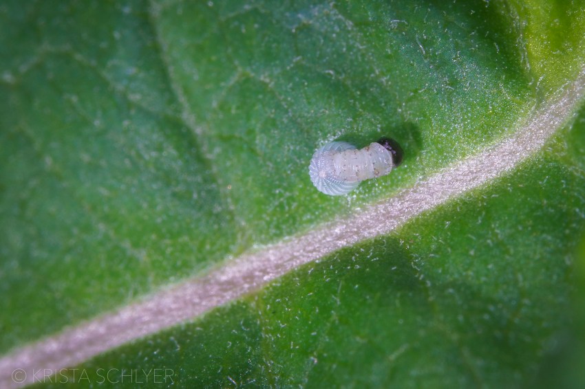 And so imagine my excitement upon finding a teeny tiny white egg glued to the bottom of one of the leaves. I did some reading and learned that it would not take long before the seemingly solid, inanimate little pearl, began to darken, just before a very small caterpillar would pop its head out. I needed to see this. So I watched and watched, visiting the plant several dozen times a day, until I began to detect a darkening.
