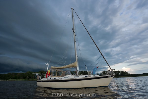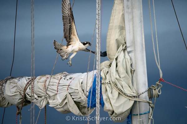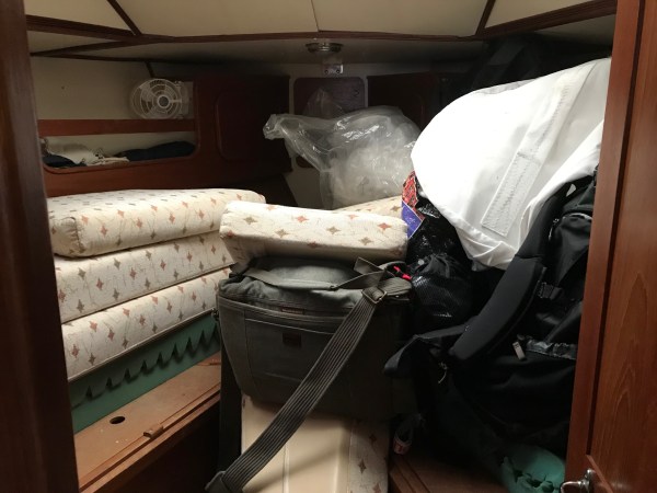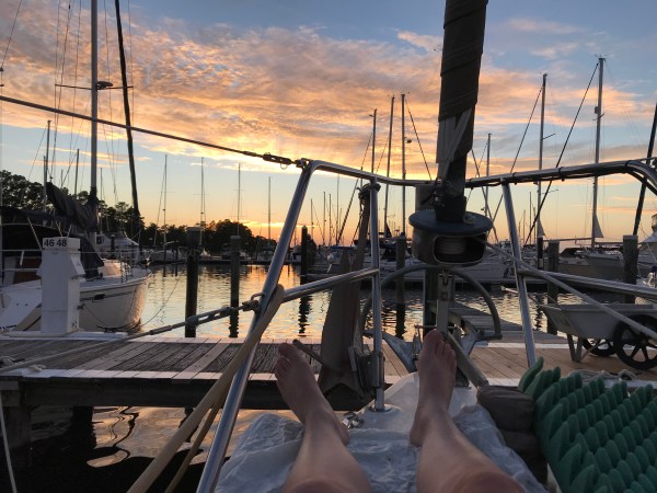As the sun rises higher in the sky I finish the last of my coffee, lay down my book, and get on with my chores for the day. I start by taking everything out of the V-Berth to find the source of an unpleasant odor. While Bill is at Captain’s Class, I’m working on a list of deeds that need doing to keep the SVMM in ship-shape. In the evenings, Bill tells me what he has learned, I outline what I have accomplished, we eat, head to our cozy berth and lay down betwixt sheet and mattress, betwixt wakefulness and sleep, betwixt gratitude and greasy hair.